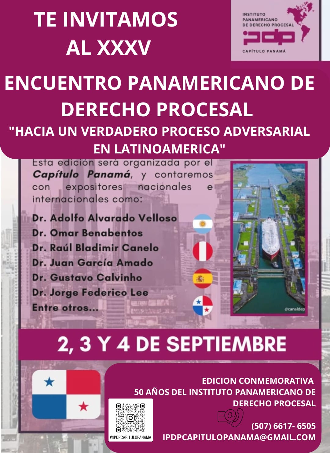 El XXXV Encuentro Panamericano de Derecho Procesal (IPDP) se desarrollarás los días 2, 3 y 4 de septiembre de 2026 en Panmá. El Encuentro coincide con la celebración del 50 Aniversario de creación del Instituto y contará con reconocidos expositores locales e internacionales.